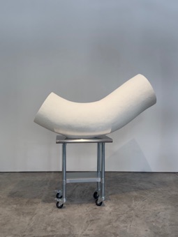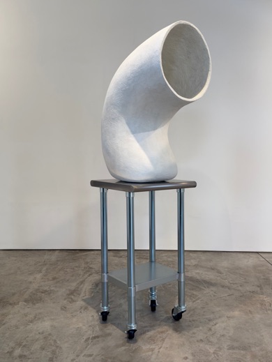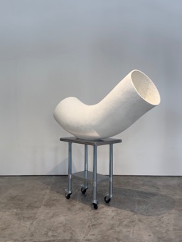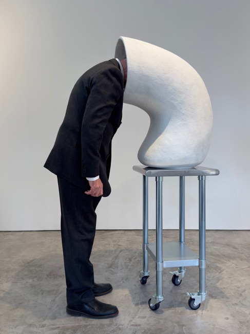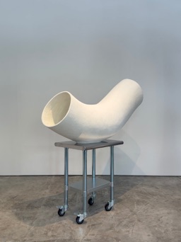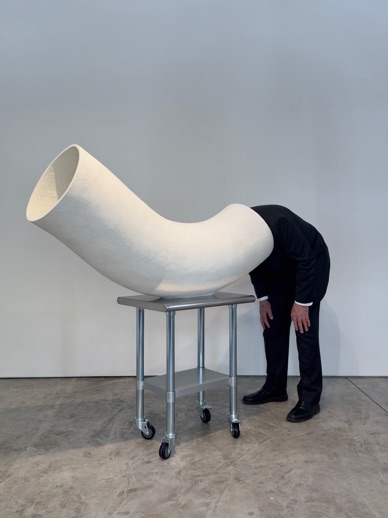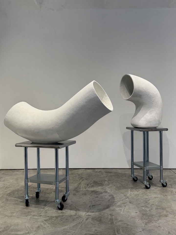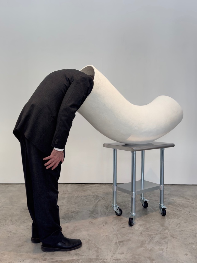 Sculpture To Hide My Head In (2024) and its follow-up, Sculpture To Hide My Head In 2 (2025), are constructed from papier-mâché and mounted on stainless steel carts—evocative of bodies on dissecting tables. My performative interaction with these works, along with their photographic documentation, is integral to the pieces. The photographs stand as artworks in their own right. The organic forms of these sculptures recall earlier works of mine that draw inspiration from the human body, such as Uvula Arch (2023) and The Semi Circular Sculpture (2023).