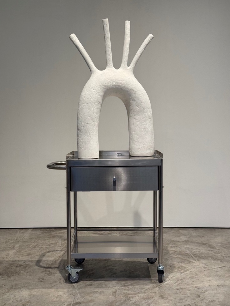 Maquette for Aorta Arch on a Medical Cart, 2025, Papier-mâché on steel with steel cart, 64” x 28” x16.5”